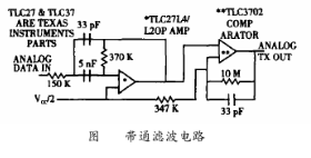 HART數字信號規范是峰值為1mA、平均值為0mA正弦交流電流信號,此信號經線路阻抗轉化為正弦交流電壓信號,而HT2012輸入和輸出信號是0~5V的方波信號,因此在HT2012和外部的HART信號之間還需要有濾波電路和整形電路。如圖3所示,由TLC27組成的濾波器是帶通濾波器,用來減少接收信號的噪聲干擾。濾波器還用來消除波形中的尖峰,從而使接收到的信號變得平緩。TLC37組成的數字方波產生回路把經過TLC27濾波后的正弦波轉變成相應的方波,以便于HT2012接收。