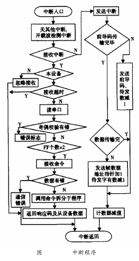 在HART通信中,鉆井泥漿流量計作為從設備進行通訊,所以這里的軟件設計只是針對于從設備。HART通信采用水平和垂直校驗的方法。當檢測到接收數據有差錯時,則等到主設備命令幀發完后,通知主設備數據接收有誤。主設備則重新發命令幀,從而保證通信的準確可靠。HART中斷子程序流程圖如圖6所示。由于HART通信為主從方式,HART幀中每個字節在物理層傳輸需要9ms左右,為了保證通訊的實時性,通訊程序采用串行口終端接收/發送。該中斷所要完成通信中的主要任務,即接收和發送幀,幀的拆分和打包。