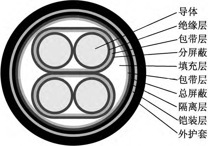 該新型電纜的結(jié)構(gòu)如圖1所示。導(dǎo)體為單股退火鍍錫軟銅線,以提高導(dǎo)體的導(dǎo)電性和防腐蝕性。在導(dǎo)體外繞包一層薄F4(聚四氟乙烯)半導(dǎo)電帶,有利于降低導(dǎo)體和絕緣之間的摩擦起電噪音。絕緣采用材料較為純凈、介電常數(shù)較小、具有一定彈性的聚丙烯絕緣級材料,并采用擠壓式擠出,減小絕緣層與導(dǎo)體的間隙。采用對絞組作為信號傳輸線,由于在兩根傳輸線上感應(yīng)的電壓接近相等,減小了電壓差值,提高了信號傳輸穩(wěn)定性;對絞組由兩種不同顏色絕緣線芯組成,相鄰線對對絞節(jié)距應(yīng)不大于100mm。對絞分屏蔽組(即對對絞組進行分屏蔽,每對對絞組外繞包兩層聚酯帶和一層厚0.04mm鋁塑復(fù)合帶繞包,內(nèi)置一根7×0.26mm鍍錫銅絞線作引流線)有利于對不同對絞組之間信號串音的抑制和隔離。對絞分屏蔽組同心式絞合成纜,在對絞分屏蔽組間填充非吸濕性材料,以保證纜芯圓整。在成纜纜芯外繞包兩層聚酯帶,再采用鋁塑復(fù)合帶繞包,內(nèi)置鍍錫銅線作引流線,以提高電纜電磁屏蔽能力。總屏蔽層外擠包隔離層(隔離護套),隔離層采用絕緣級低密度聚乙烯材料。隔離層外采用鎧裝層,鎧裝材料為高導(dǎo)磁合金鋼帶,其為強磁材料,可將外來的磁通大部分限制在鎧裝層的外表面上(僅有少部分能進入被屏蔽的空間);鎧裝時對高導(dǎo)磁合金鋼帶采用縱包焊接,確保其形成一連續(xù)圓柱管;鎧裝層可提高電纜抗電磁干擾水平以及對電纜進行加強,減少電纜振動引起的電動勢。外護套采用藍色軟PVC(聚氯乙烯)護層級電纜材料擠包,實現(xiàn)電纜防護。