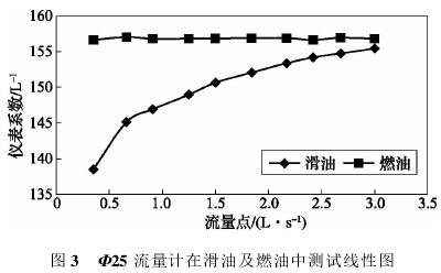 依據表3測試數據,經計算可得,Φ25流量計在滑油及燃油中測試結果如表4所示,測試線形圖如圖3所示。