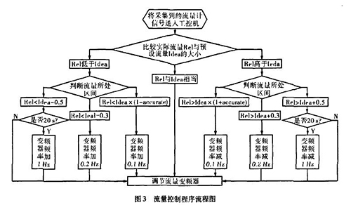 實際生產中流量一直在某個區域內波動,且其動態特性不易掌握。從上面的理論中我們能夠讓誤差△£盡可能的小,這樣距我們所需要的理論值%就越接近。而減小誤差需要我們把n取的盡可能大,也就是在生產時間內劃分更多的周期去調節流量。當工控機根據稀硝酸專用流量計傳送回來的信號發出調節變頻器工作頻率的指令后,電機調整功率到稀硝酸專用流量計的實際測量為一個工作周期,我們知道從指令發送到實際測量值返回有一個較大的滯后,如果調節的周期時間小于流量計本身的一個工作周期,那么顯然不可能達到減小誤差的目的。利用模糊控制思想H。,在控制程序中我們把流量的波動區域劃分為±缸×Yo,Yo-t-O.3,Yo±0.5四個區域,其中缸為可調節的誤差范圍,生產中我們取0.015,流量區域劃分的單位均為t/h。針對不同的區域采取不同的調整方案。具體流程如圖3所示。圖中變量Rel表示實際測量的流量,變量Idea表示理論流量。