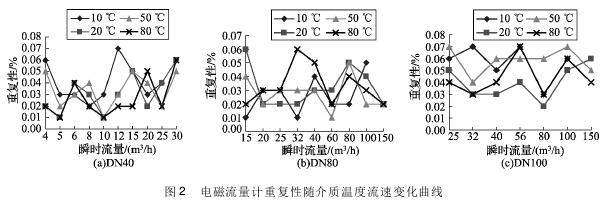 將實驗測得的環保污水專用流量計在不同溫度及流速下的重復性數據整理,特性曲線如圖2所示,3組曲線分別對應DN40、DN80、DN100的3塊環保污水專用流量計的重復性曲線。