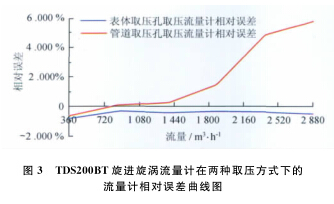 例,系統運行時間為60s,標準裝置的滯止平均溫度為29.7℃,空間平均濕度為42%,流量計的平均溫度為29.3℃,在表體取壓孔取壓和管道取壓孔取壓的流量計檢定試驗數據分別如表3、4所示。兩種取壓方式下的流量計相對誤差曲線如圖3所示。
