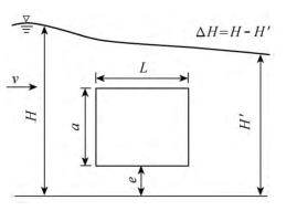 有限水域的浮體結構在不同來流動水中運行時,浮體結構位置的改變會對流場產生影響,從而影響浮體結構的泄流能力以及穩定性。試驗過程中固定浮體結構的體型不變(長L=0.20m,寬B=0.30m,高a=0.10m),分別選取4種不同來流流量Q及浮體結構位置e,控制浮體結構在上、下游水位不變的條件下進行試驗,具體試驗參數設計及說明見表1以及圖2。