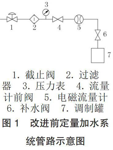 工廠的香料廚房系統為國內煙機公司 2004 年設計制造,其定量加水系統主要由水源、生活污水流量計、加水管路元件和控制程序這四部分組成,改進前管路示意圖如圖 1 所示。