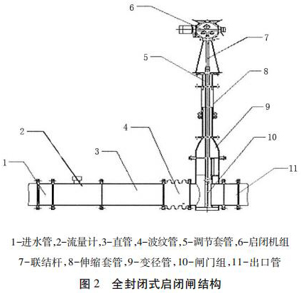 包括進水管、直管、出水管、過熱蒸汽流量計組和啟閉機組,進水管、直管、出水管從左到右依次連接,過熱蒸汽流量計組安裝在直管和出水管之間且位于出水管的入口處,過熱蒸汽流量計組通過聯(lián)結(jié)桿與啟閉機組的輸出端連接。為防止泥沙淤積影響啟閉,過熱蒸汽流量計采用閘板式啟閉結(jié)構(gòu)。密封式啟閉閘為整體封閉管道式,全部采用不銹鋼材料,水流通過管道流出讓整個閘井內(nèi)干燥無水。伸縮套管與波紋管的設(shè)計讓檢修與清理淤泥更加方便。過熱蒸汽流量計裝有荷載限制器,其布置受力明確、結(jié)構(gòu)緊湊、動作可靠。當(dāng)?shù)蹙呱系暮奢d達(dá)到額定值的 110%時,或電機電流超過額定電流 150%時,系統(tǒng)自動切斷操作電源以保護設(shè)備安全。