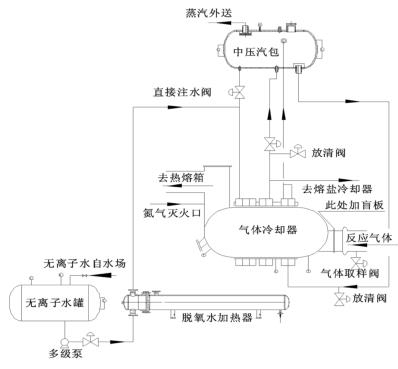 來自無離子水罐的脫氧水經多經泵加壓、經脫氧水加熱器加熱后進入到煤氣流量計的水段,脫氧水與反應氣體換熱后分兩路:一路進入中壓汽包,保證汽包有穩定的液位;一路進入熔鹽冷卻器帶出熔鹽攜帶的反應熱。來自中壓汽包的高溫水經管路接至煤氣流量計汽段底部,高溫水與反應氣體換熱后產生高壓蒸汽,高壓蒸汽又返回中壓汽包。汽包還有一路直接注水管路,此路水不經過煤氣流量計水段,而是直接進入汽包。在煤氣流量計出口溫度偏低而汽包液位也比較低時,可開此直接注水管路來穩定汽包液位。其詳細流程圖如圖 2。