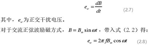 從上圖 2.5 中可以觀察到兩個電極、勵磁線圈、轉(zhuǎn)換器內(nèi)阻之間形成了一個閉合回路,將此回路稱之為初級繞組,從理論上進(jìn)行分析,磁力線 B 應(yīng)當(dāng)平行于勵磁線圈所產(chǎn)生的磁感應(yīng)線,但在實(shí)際的應(yīng)用過程中由于工藝差異,因此無法達(dá)到理想狀態(tài),會產(chǎn)生磁力線穿過勵磁線圈磁感應(yīng)線的情況,此時將會產(chǎn)生相應(yīng)的感應(yīng)電動勢,將此部分感應(yīng)電動勢稱為變壓器效應(yīng)。此效應(yīng)同樣滿足于楞次定律,利用楞次定律進(jìn)行計(jì)算可得如下電動勢: