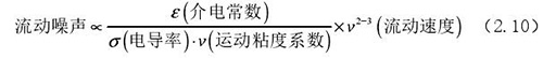 流動噪聲主要出現(xiàn)在低電導(dǎo)率流體的檢測中,由輸出端輸出的直流極化電壓時常出現(xiàn)左右擺動的現(xiàn)象,而此種擺動的電壓被稱為流動噪聲。上式(2.5)中可以觀察了解到流體電導(dǎo)率和流動噪聲呈現(xiàn)出負(fù)相關(guān)關(guān)系,由此可以了解到在進(jìn)行低電導(dǎo)率的計(jì)算中需要重點(diǎn)考慮位移電流。