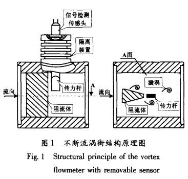 不斷流渦街同樣是以卡門(mén)渦街原理為依據(jù)測(cè)量流體流速的,但不斷流渦街表體已經(jīng)在結(jié)構(gòu)上有了質(zhì)的改變。如圖1所示,它將普通渦街單一的信號(hào)檢測(cè)傳感頭改變?yōu)閭髁U與信號(hào)檢測(cè)傳感頭兩部分,并通過(guò)隔離裝置完全隔離。當(dāng)表體中流過(guò)流體并產(chǎn)生漩渦時(shí),由傳力桿檢測(cè)漩渦的變化,并以力的形式傳遞給信號(hào)檢測(cè)傳感頭,完成了力信號(hào)到電信號(hào)的轉(zhuǎn)換過(guò)程。雖然傳力桿與流體直接接觸,但其本身只是進(jìn)行力傳輸?shù)母軛U,因此,只對(duì)外形尺寸及鋼材選擇上具有要求。而信號(hào)檢測(cè)傳感頭是通過(guò)隔離裝置與流體完全密閉隔離的,再加上隔離裝置本身具有的散熱功能,使得信號(hào)檢測(cè)傳感頭的使用溫度要遠(yuǎn)遠(yuǎn)低于流體的實(shí)際溫度,從而有效地提高了普通信號(hào)檢測(cè)傳感頭的可測(cè)介質(zhì)溫度。同時(shí),不斷流渦街在進(jìn)行維修更換信號(hào)檢測(cè)傳感頭時(shí),并不影響工藝管道內(nèi)流體的流動(dòng),真正實(shí)現(xiàn)了信號(hào)檢測(cè)傳感頭的不斷流拆裝維護(hù)。