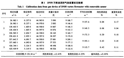 在實(shí)際標(biāo)定過(guò)程中,相同口徑的不斷流渦街與普通煤氣流量計(jì)在可測(cè)流量范圍、基本誤差、重復(fù)性等參數(shù)上基本一致,達(dá)到了設(shè)計(jì)和使用精度的要求。