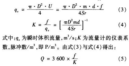 式中:m為漩渦發(fā)生體兩側弓形面積與管道橫截面面積之比;D為表體通徑,~;d為漩渦發(fā)生體迎面寬度,~;f為漩渦的發(fā)生頻率,Hz;U:為漩渦發(fā)生體兩側平均流速,耐s;sr為斯特勞哈爾數(shù);U為被測介質(zhì)來流的平均速度,耐s。管道內(nèi)體積流量q。為: