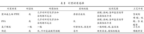 防腐型電磁流量計要根據(jù)被測流體的溫度、壓力、速度以及含固顆粒的硬度、含量和粒徑大小來決定測量管內(nèi)襯的材質(zhì)。該濕法磷酸裝置中,防腐型電磁流量計測量管襯里材質(zhì)的種類見表 2。