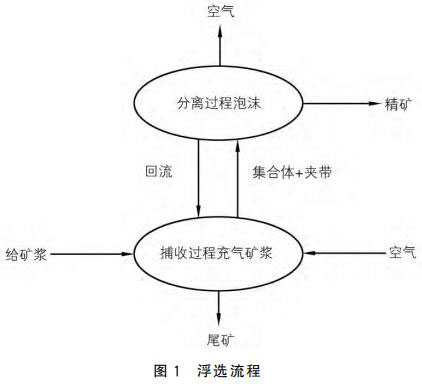 浮選是依據(jù)礦物原料表面的化學(xué)性質(zhì),向待浮選的礦漿中加入浮選藥劑和空氣,使其與礦漿充分融合,并根據(jù)各礦物原料的黏附程度的不同,分選出不同的礦物。浮選過(guò)程一般分為礦漿碰撞、黏附、上浮以及精煤溢出四個(gè)階段。礦物原料在浮選藥劑的作用下,與 空氣發(fā)生器產(chǎn)生的小氣泡發(fā)生充分碰撞,進(jìn)行礦物捕集。利用礦物間的疏水特性,礦物粘附于氣泡表面,氣泡不斷上浮,形成精礦泡沫層,精礦溢出浮選柱;由于尾礦的親水特性,尾礦沉入底部并排出。浮選流程如圖1所示。
