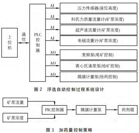 圖3中的礦漿流量與礦漿濃度分別由科氏質(zhì)量流量計(jì)和超聲波流量計(jì)測(cè)得,并 以4~20mA 電流信號(hào)傳送給 PLC控制器。由 PLC控制器根據(jù)電流信號(hào)值計(jì)算出實(shí)際的礦漿濃度和礦漿流量值,對(duì)上述兩個(gè)值進(jìn)行邏輯處理以及運(yùn)算,得出實(shí)時(shí)加藥量。PLC 控制器將計(jì)算出的實(shí)時(shí)加藥量數(shù)據(jù)以4~20mA 的電流信號(hào)發(fā)送給隔膜計(jì)量泵,由其控制并實(shí)現(xiàn)加藥量過(guò)程的自動(dòng)控制。