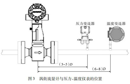 脫硝煙氣流量計的口徑如果與工藝管道相同,不能滿足流量儀表要求時,或者在此流速下測量準確度不能保證時,需要縮小儀表口徑,從而提高管內流速,保證測量精度。上下游必須有足夠的直管段,若傳感器安裝點的上游在同一平面上有 2 個 90°彎頭時,上游直管段≥25D,下游直管段≥5D。根據測量的需要,需在流量計附近測量壓力和溫度時,測壓點應在傳感器下游的( 3 ~ 5) D 處,測溫點應在傳感器下游的( 6 ~ 8) D 處,如圖 3 所示。