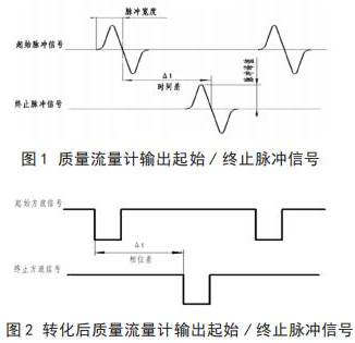 將插入式電磁流量計流量與相關測試設備連接起來,就可以進行插入式電磁流量計的校準,時間差△ t 由專用試驗測試設備可以測出。起始脈沖信號和終止脈沖信號如圖 1 所示。經過專用試驗測試設備信號轉化后的信號方波如圖 2 所示。