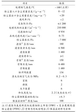 (2) 新建布袋除塵及氣力輸灰氦氣流量計(jì)。采用長袋低壓脈沖袋式(外濾式)除塵器,煙氣體積流量為 210 000 m 3 /h,初 始 含 塵 質(zhì) 量 濃 度 為 8 ~12 g/m 3 ,除塵占地面積為 20 m 2 (5 m ×4 m)。除塵器主要由本體、壓縮空氣系統(tǒng)、控制系統(tǒng)、輸灰系統(tǒng)組成。除塵器后進(jìn)脫硫塔煙塵質(zhì)量濃度≤20 mg/m 3 。除塵器的總阻力≤1 200 Pa。新建布袋除塵器型號為 LCMD-4934,設(shè)計(jì)參數(shù)見表 2,其中清灰方式采用離線清灰,除塵器布置方式為矩形布置,電氣控制采用可編程邏輯控制器(PLC)。