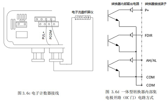1.4.5 頻率(脈沖)、上下限報警、流向標示等輸出均為集電極開路的電平輸出信號。