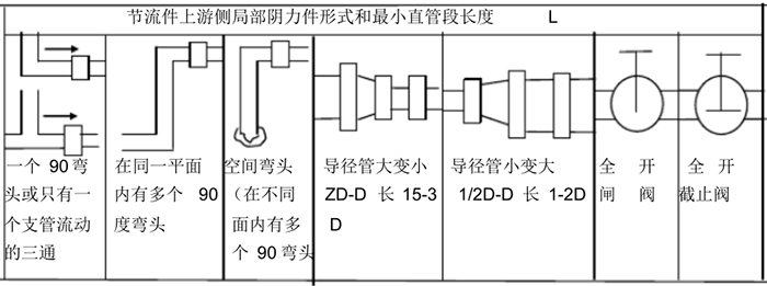 節流裝置的安裝和適用于下列管段和管件有關:節流件上游側*一阻力件、*二阻力件,節流件下右側*一阻力件,從節流件上游*二阻力件到下游*一阻力件之間的管段以及差壓訊號管路等。