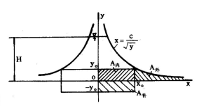 即縱坐標y值趨近于零時,橫坐標x值趨近無窮大。這在堰板的實際制作上是無法實現(xiàn)的。若將堰口曲線的*低縱坐標取為yo,在yo一下至(-yo)增開一矩形,即高為2yo,寬為2x。的補償孔,從數(shù)學(xué)上可以證明,坐標原點以下所增大的矩形面積(A補)正好等于舍去的曲邊面積(A補)。由圖3可知