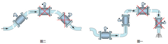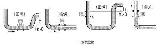 ⑴為了避免由夾附氣體引起的測量誤差,請(qǐng)觀察如下安裝方法:見圖-1,錯(cuò)誤安裝—裝在管線走向*高點(diǎn)(在測量中容易聚集空氣泡)。