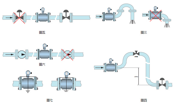 ⑹入口直管段≥DN×5長,出口直管段≥DN&×2長(DN為流量計(jì)公稱通徑),從電極軸線開始測量。