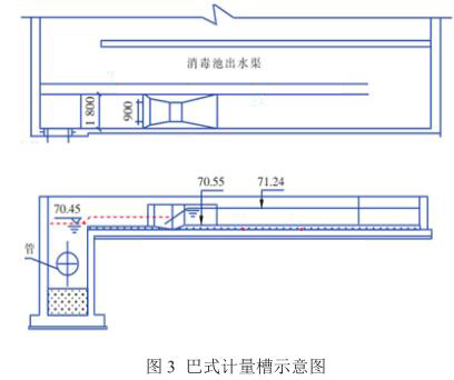 該廠改造后出水經(jīng)二氧化氯消毒后直接排放,為節(jié)省占地,出水明渠與接觸消毒池合建,位于接觸池末端。消毒池出水經(jīng)堰板跌水后通過2.3米的孔洞180°轉(zhuǎn)彎流入出水計量明渠。如圖3所示。采用巴式計量槽+超聲波液位計測定流量。